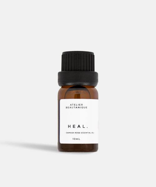 Atelier Beautanique HEAL. Rose Essential Oil 10mL Bottle on Grey Background with Light Shadow